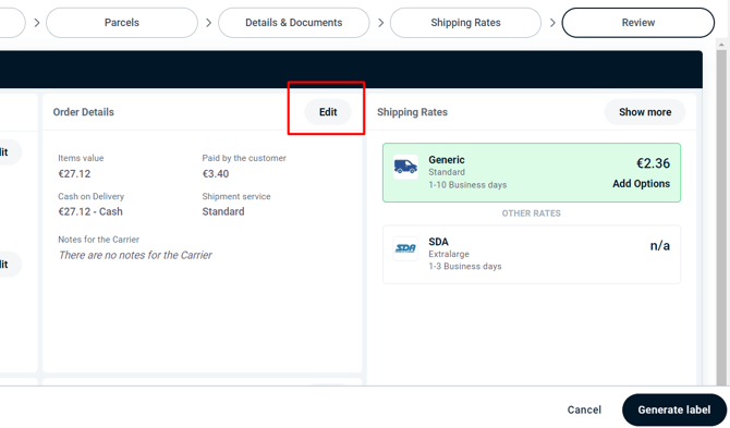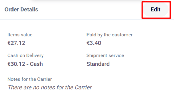 If you'd like to change the payment method or edit the COD value, click on the Ship icon on the right side of the order, then click on Edit in the Order Details: