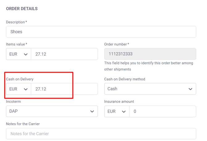 Eg. Original COD value: 100€, by adding 5€ surcharge it will be indicated the total amount of 105€ in COD field from Carrier's info.