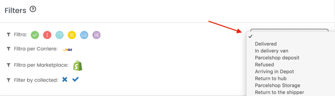 You can filter your shipments by Status, Carrier, Marketplace or simply see the collected and the not collected ones.