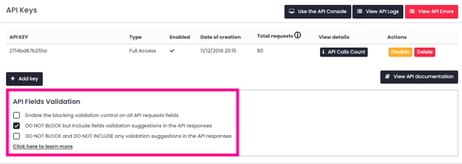 - NO BLOQUEAR y NO INCLUIR sugerencias de validación en las respuestas de la API: te permite no bloquear la llamada y no mostrar ninguna sugerencia para el error