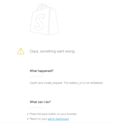 Si no puedes acceder a las autorizaciones de la aplicación Shopify y ves esta página de error: