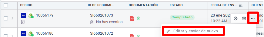Para modificar la información de envío, simplemente haz clic en el ícono de los tres puntos a la derecha del pedido y selecciona la opción "Editar y enviar de nuevo".