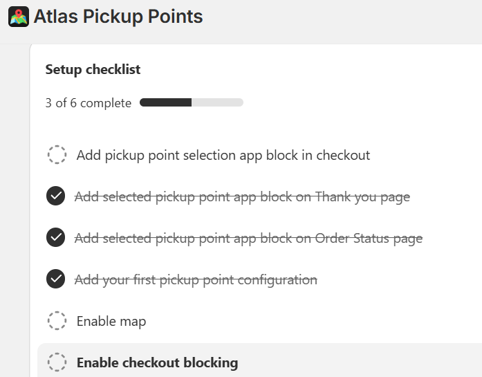 Après avoir installé l'application Atlas dans Shopify, la Liste de contrôle de configuration Atlas vous guidera à travers les étapes clés de configuration (Applications > Atlas Pickup Points > Add Configuration).