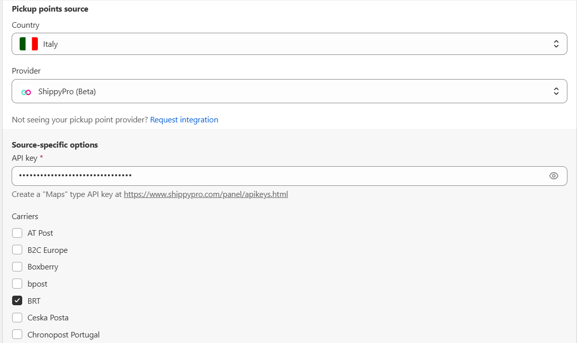 - Atlas configuré avec l'intégration ShippyPro : entrez votre clé API ShippyPro dans le back-office d'Atlas. Vous trouverez votre clé API dans ShippyPro sous Checkout > Maps Setup > API Key.