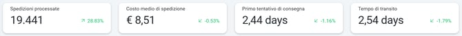 Numero di spedizioni elaborate e spedite. Consideriamo le spedizioni "elaborate" se sono state ritirate dal corriere e hanno ricevuto lo stato In transito dal corriere nel periodo di tempo selezionato. Escludiamo tutti gli ordini che non sono stati effettivamente spediti.