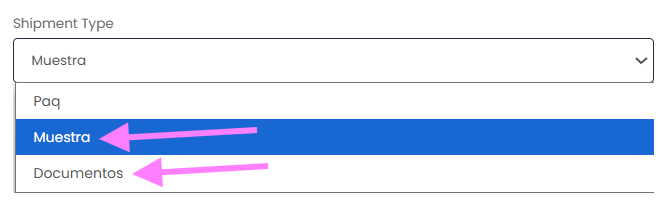 - Clicca sul menù a tendina "Shipment Type" e seleziona "Muestra" o "Documentos" in base alle tue esigenze;
