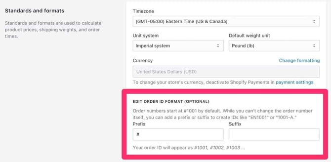 Se si utilizza Shopify, è possibile modificarlo dal proprio account Shopify > Preferenze > Impostazioni generali > Fare clic sulla formattazione accanto a ID ordine e aggiungere un prefisso o un suffisso: