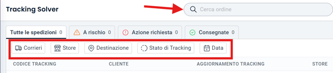 Cerca ordine: inserisci codici di tracciamento, numeri d'ordine, nomi dei clienti o indirizzi e-mail per trovare immediatamente spedizioni specifiche.