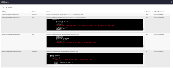 Da API > API > Visualizza errori API, è possibile consultare tutta la cronologia degli errori. Questo tiene traccia delle chiamate NOK e dei relativi dettagli di errore: