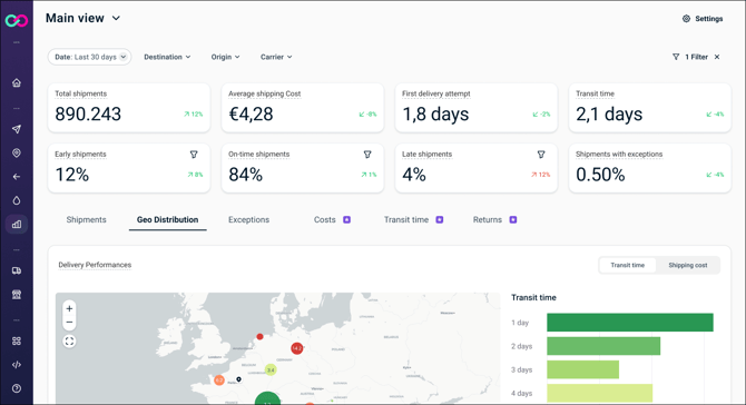 Ottenere informazioni geo-localizzate e granulari in tempo reale: Filtra per data, origine, destinazione e corriere per ottenere KPI dettagliati sulle prestazioni. Identificare le regioni più costose o lente.