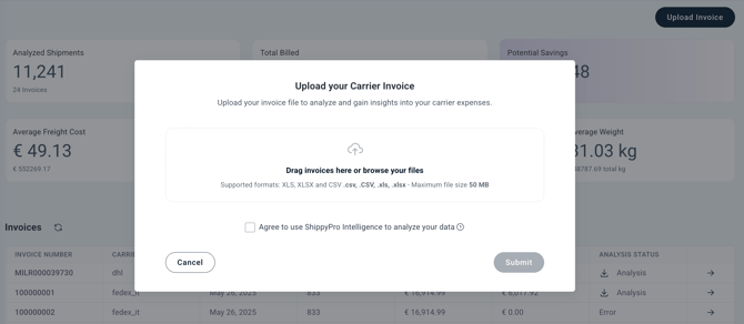 Invoice Analysis/Analisi Fatture è lo strumento che ti aiuta ad analizzare le fatture dei corrieri e a identificare discrepanze e anomalie per ridurre i costi di spedizione. Con pochi clic, puoi caricare le fatture, suddividere le spese di trasporto e scoprire costi aggiuntivi che potresti non aspettarti.