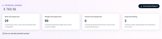 Tuttavia, per poter beneficiare dell'analisi delle discrepanze, in cui gli importi fatturati vengono confrontati con i propri dati di spedizione, le spedizioni devono essere presenti nel proprio account ShippyPro. Se le spedizioni non sono presenti in ShippyPro, sarà comunque possibile visualizzare il dettaglio completo della fattura (trasporto, supplementi, tasse, ecc.), ma non i risultati delle discrepanze spedizione per spedizione.