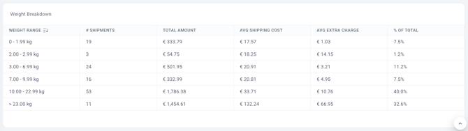 💡Suggerimento: se clicchi su un intervallo di peso nella prima colonna, puoi approfondire per visualizzare l'elenco dei codici di tracciamento associati a quell'intervallo specifico.