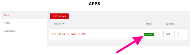 Dopo qualche ora potrai controllare il tuo profilo DHL Developer dove dovresti essere in grado di visualizzare l'App Status come approvato.