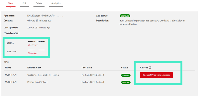 Clicca su DHL EXPRESS - MYDHL API sotto App Name e troverai un pulsante rosso Request Production Access, una volta selezionato riceverai la conferma di invio della richiesta in pochi minuti e sarà il team DHL locale a doverla approvare secondo le loro tempistiche.