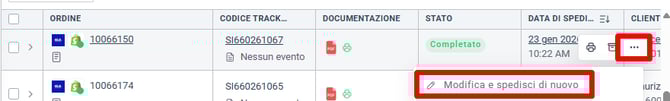 Per modificare un'informazione di spedizione, puoi cliccare sull'icona dei tre puntini sulla destra dell'ordine e poi su "modifica e spedisci di nuovo".