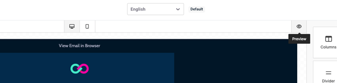- Modalità di anteprima: Visualizza l'aspetto della tua e-mail su dispositivi desktop e mobili facendo clic sulle icone Desktop e Mobile. Puoi anche accedere alla modalità di anteprima facendo clic sull'icona a forma di occhio in alto a destra del modello.