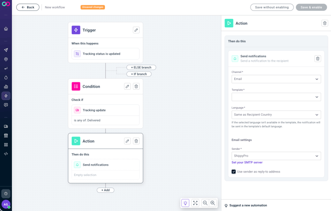 - Configura i tuoi flussi di lavoro — Definisci trigger e condizioni per inviare notifiche automaticamente in base a stati di tracciamento precisi