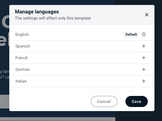 È possibile aggiungere facilmente altre lingue dalla pagina dei modelli. Fare clic sul menu a tendina Lingua nella parte superiore del generatore di modelli, quindi selezionare Aggiungi lingua. Scegliere le lingue desiderate facendo clic sull'icona + accanto a ciascuna di esse.